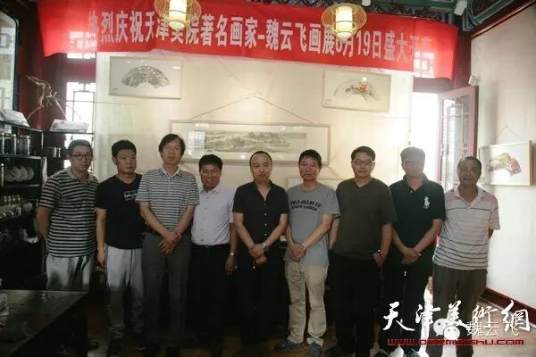 魏云飞作品展在集真阁开幕,图为刘文生、路洪明、魏云飞、李旭飞、马明等在展览现场。